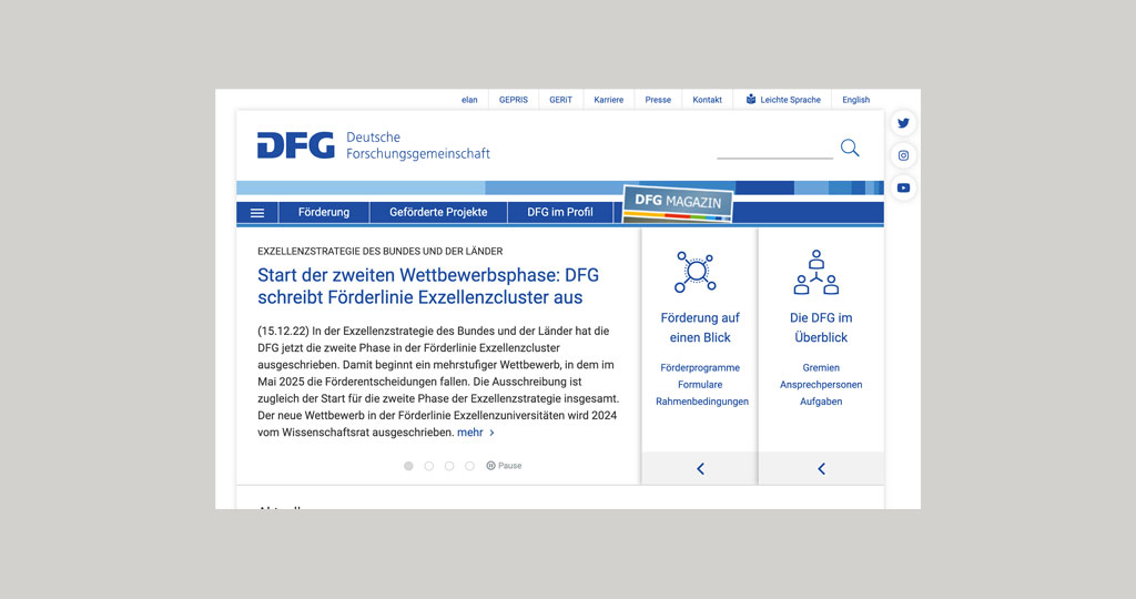Die Deutsche Forschungsgemeinschaft (DFG) ist die zentrale Förderorganisation für Forschung in Deutschland. Sie stellt im Rahmen ihres Web-Auftritts mit über 10.000 Seiten und 4.000 Dokumenten ein sehr umfangreiches Informationsangebot zur Verfügung, welches die Antragsbearbeitung als Kerngeschäft der DFG unterstützen soll.